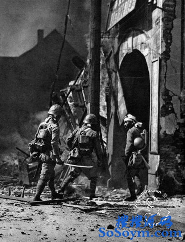 • 1937年10月,日军在上海闸北战斗中与中国军队进行激烈巷战,图为一名日军拔出武士刀,杀气腾腾,准备进屋搜索。